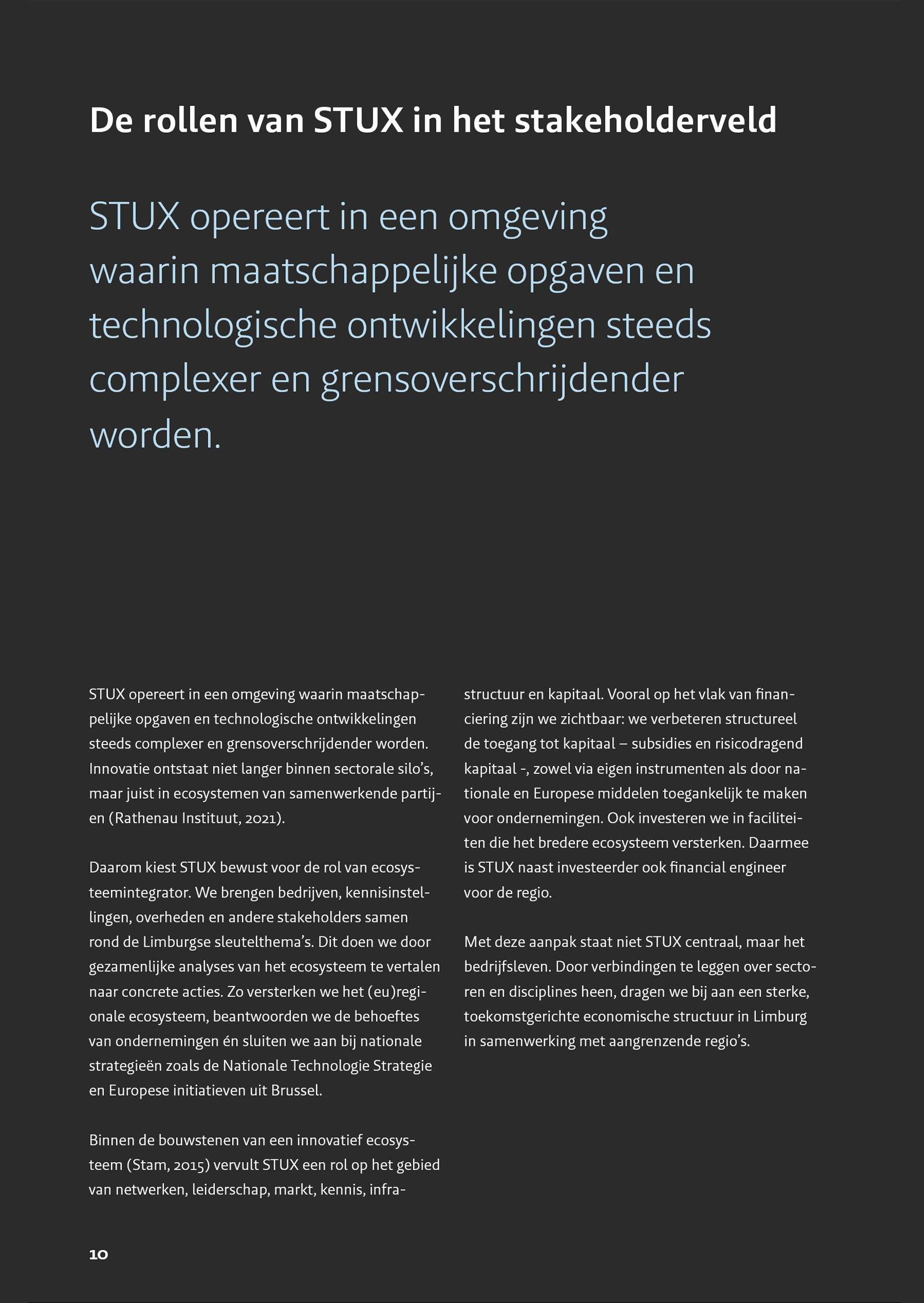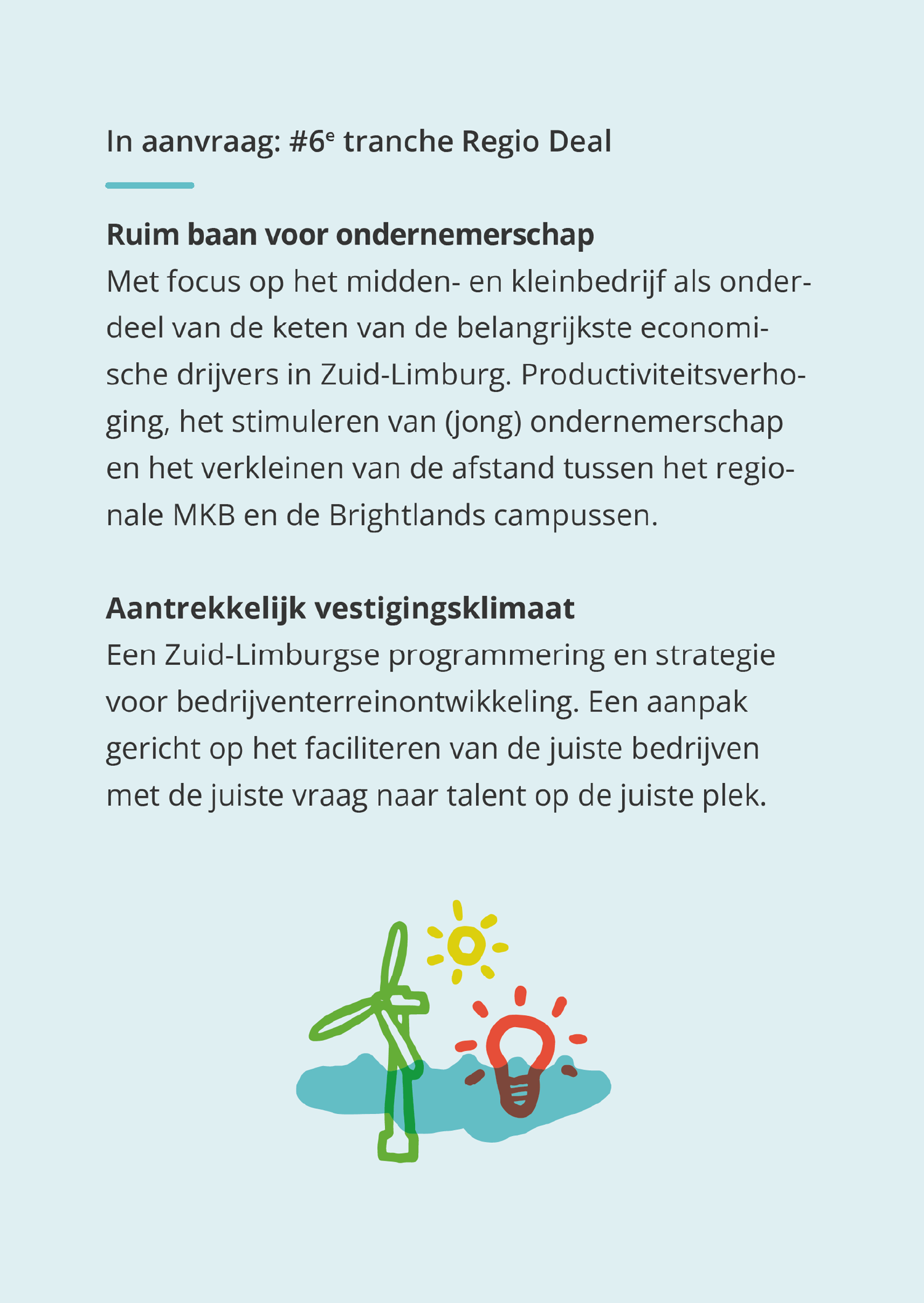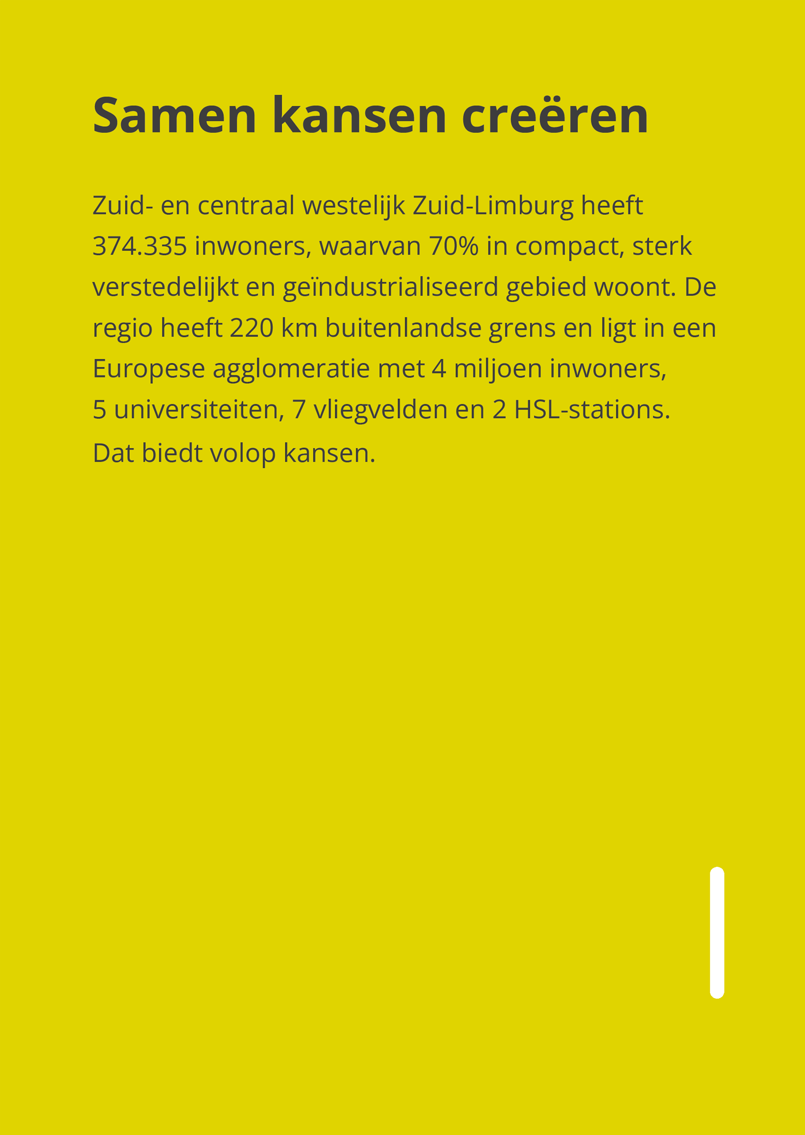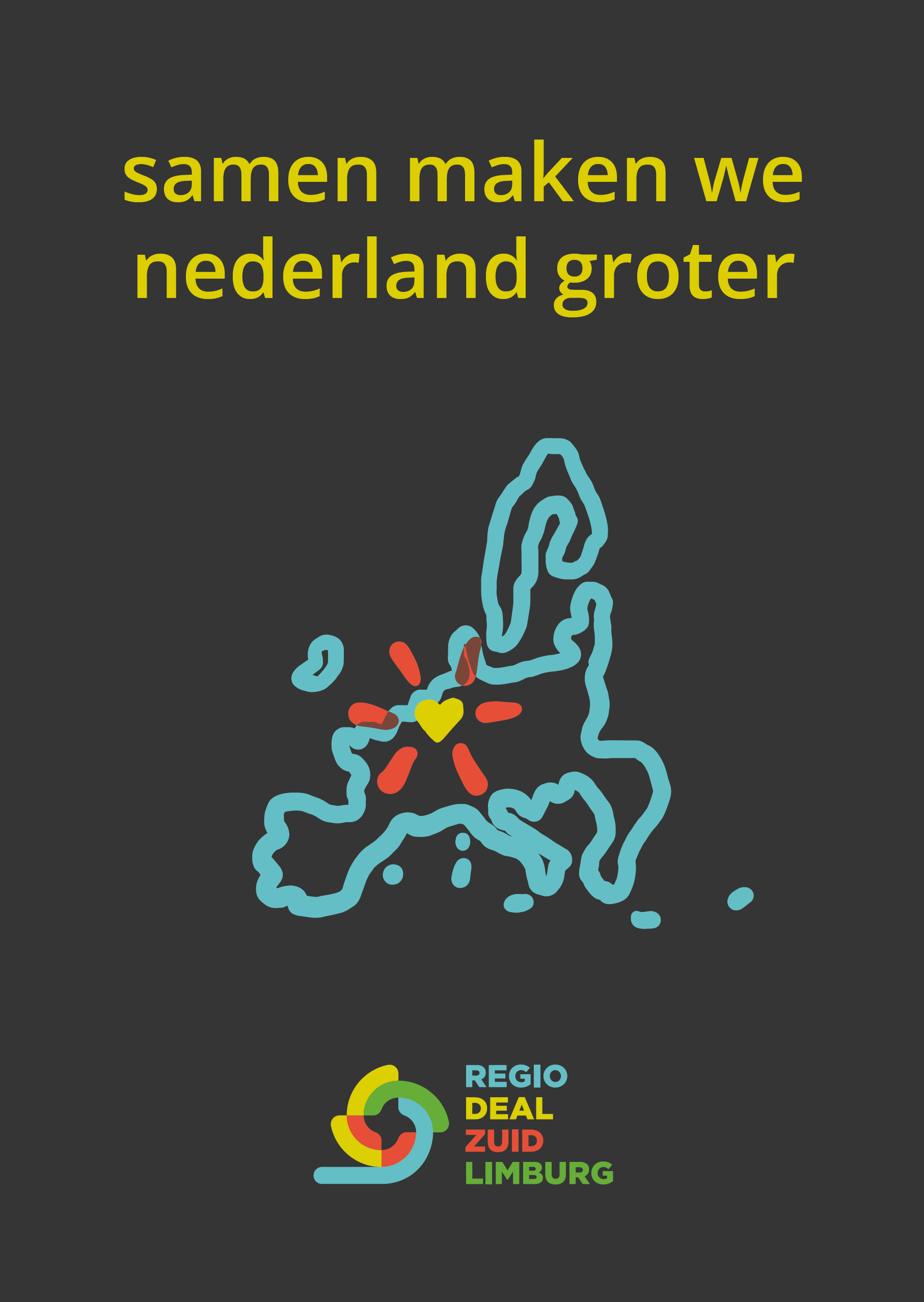'Zuid-Limburg is een regio om mee rekening te houden. Een streek waar lokaal, regionaal en internationaal wordt samengewerkt. Voor ons zijn er geen grenzen. En met nee nemen we geen genoegen. Achterblijven is geen optie. We zetten Zuid-Limburg samen op de kaart. Op regiodealzuidlimburg.eu presenteren 10 Zuid-Limburgse gemeenten 14 projecten die zich richten op economische groei, het versterken van de leefbaarheid en het bereiken van welvaart voor iedereen. Studio-ux verzorgde de huisstijl en de website, met illustraties van Stang Gubbels.