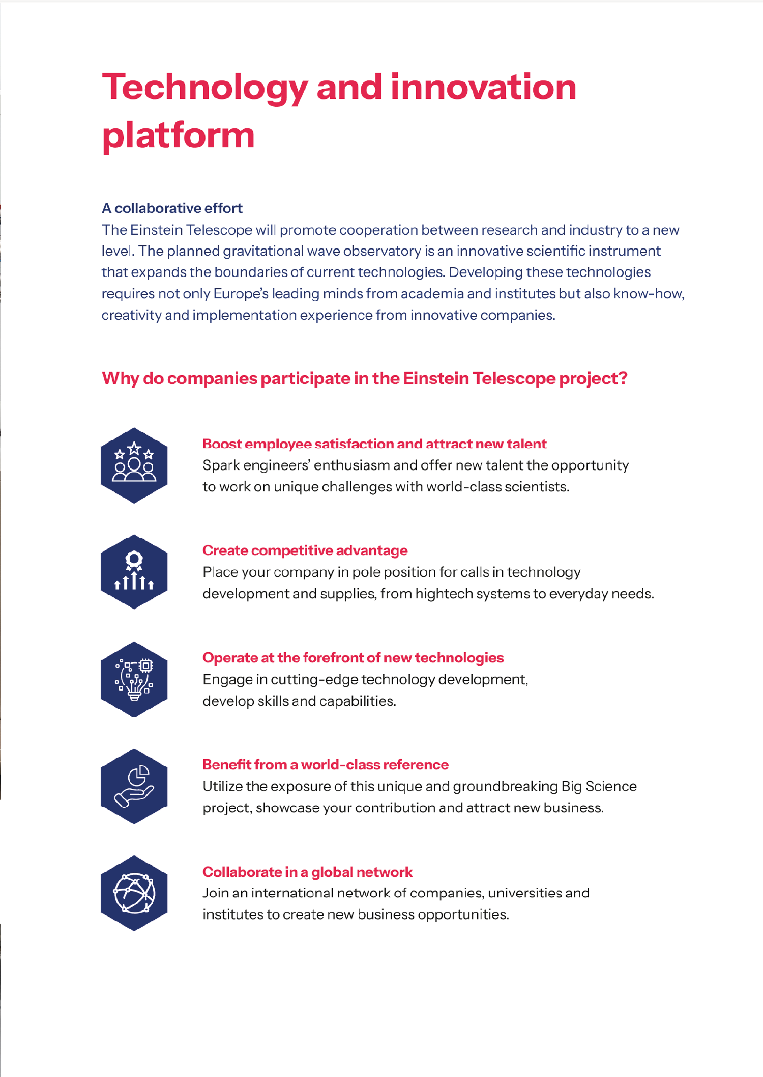 'Gezocht: hightech ondernemers die mee willen bouwen aan de Einstein Telescope' is de eerste zin op de homepage van deze site. Om innovatie en versnelde ontwikkeling van nieuwe technologieën voor de Einstein Telescope te stimuleren is een website ontwikkeld. 'Dit helpt Nederland zich nog meer te positioneren als internationaal knooppunt van technologische vooruitgang' aldus Robbert Dijkgraaf, minister van Onderwijs, Cultuur en Wetenschap.
